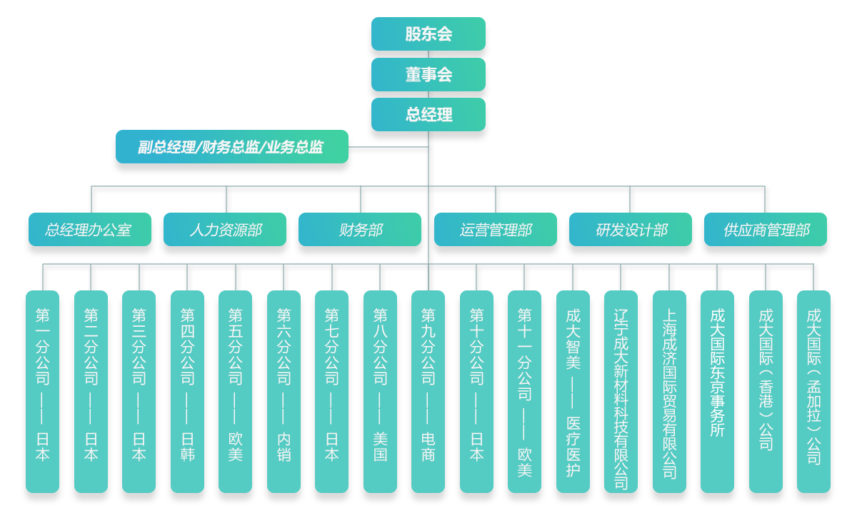 遼寧成大國際貿易有限公司是繼承遼寧成大股份有限公司原有主營業(yè)務——紡織服裝進出口貿易,改制成立的控股子公司。30年來,成大國際已由傳統(tǒng)的紡織服裝貿易公司發(fā)展成為具備研發(fā)設計、前沿營銷、跨國采購和物流服務為一體的增值貿易服務商,為客戶提供一站式整體解決方案。公司總部位于大連,在上海、東京設有全資子公司。
